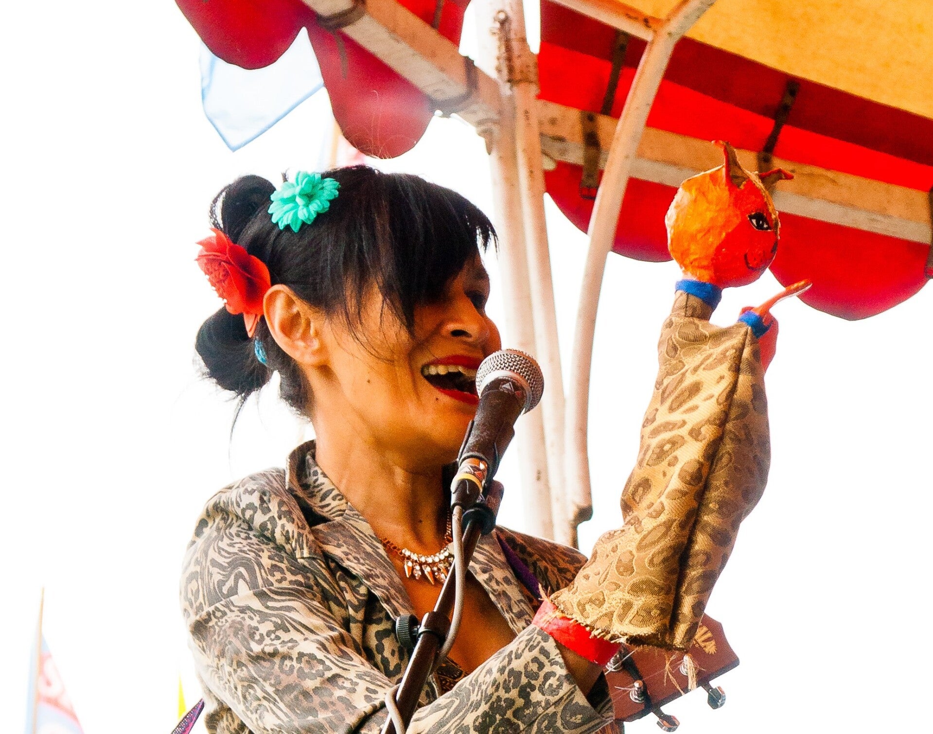 Met de zelfgemaakte wayang-pop verschijnen de kinderen op het podium in de theatervoorstelling om te zingen en te dansen en samen met Patries op een creatieve manier de vrijheid te vieren.